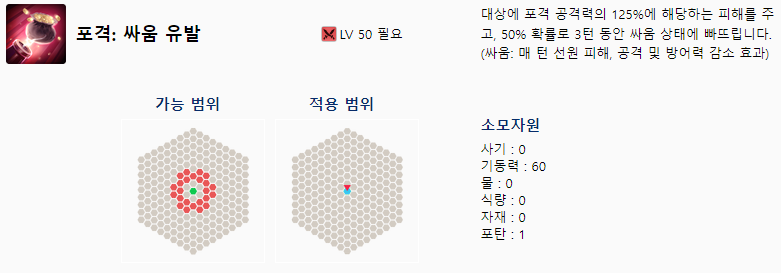 백병 : 싸움 유발 교전기술은 대상에 백병 공격력의 125%에 해당하는 피해를 주고, 50% 확률로 3턴 동안 싸움 상태에 빠뜨립니다. (싸움: 매 턴 선원 피해, 공격 및 방어력 감소 효과)