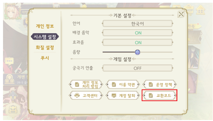 - 메인화면 > 프로필 > 시스템 설정 > 교환코드 > 코드 입력