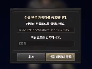 캐릭터 선택 화면에서 [선물 코드 등록] 버튼을 누르시면 선물 코드와 비밀번호 입력 창이 나타납니다.