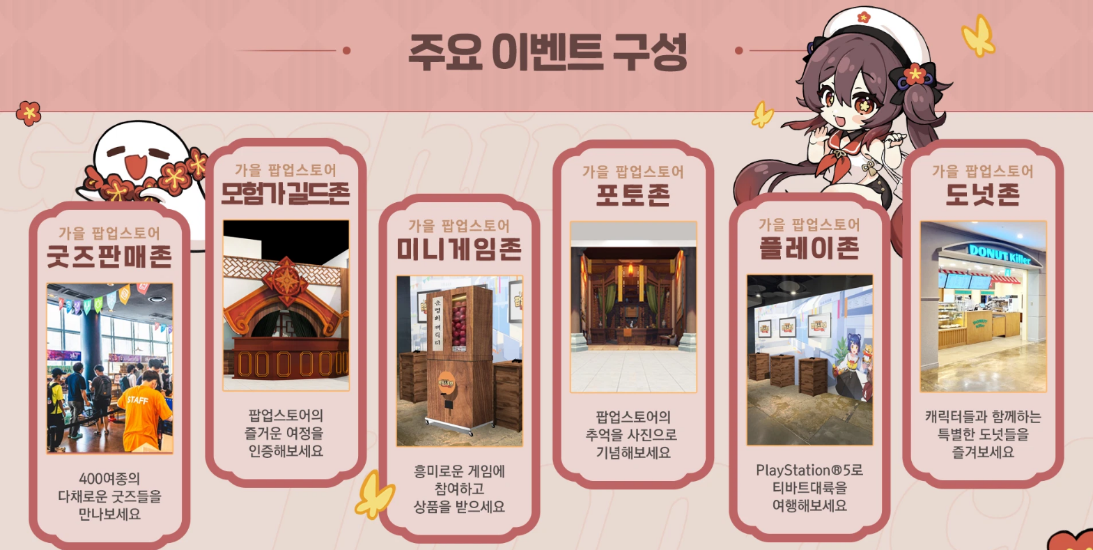 원신 굿즈 판매존, 모험가 길드존, 미니게임존, 포토존, 플레이존, 도넛존