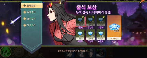 출석 보상, 접속 보상, 시즌 별로 진행하는 이벤트 재화를 다이아, 속성석과 같은 재화들로 교환할 수 있는 교환 상점,