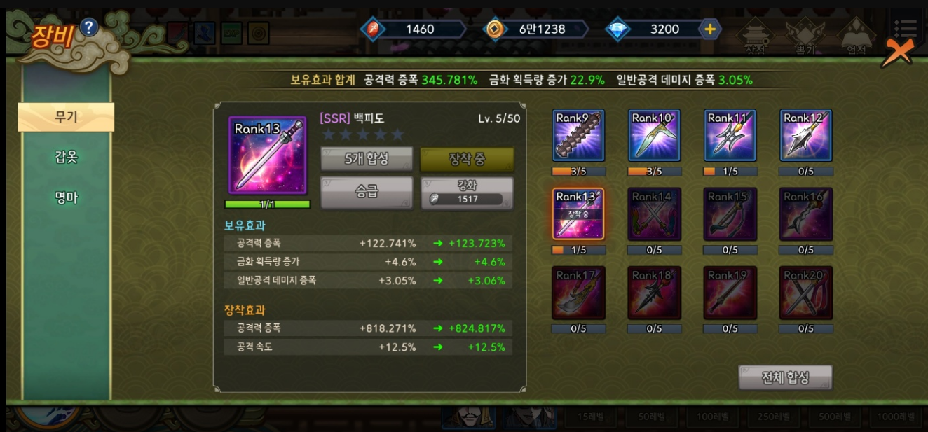 장비는 더 높은 랭크일수록 보유, 장착 효과가 늘어나는 더 좋은 장비이므로 어떤 조합을 구상해야 할지 고민할 필요가 없습니다.