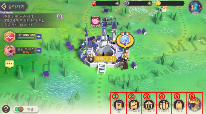 - 축복 갱신 : 축복 갱신까지 남은 시간 표시 - 축복 도시가 되면 생산량 보너스 적용과 도전권 소모도 절반으로 줄어듭니다.