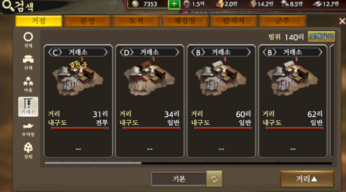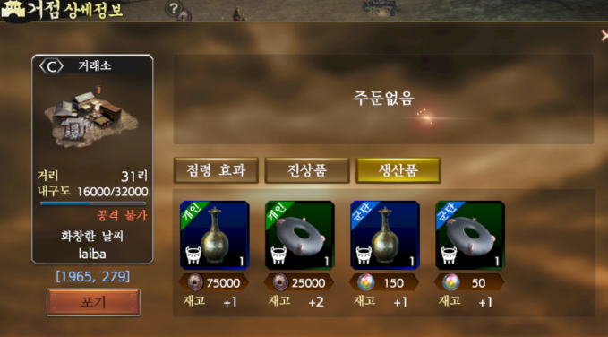 「진상품」과 「생산품」은 거점의 상세정보에서 확인할 수 있습니다.