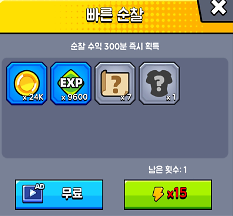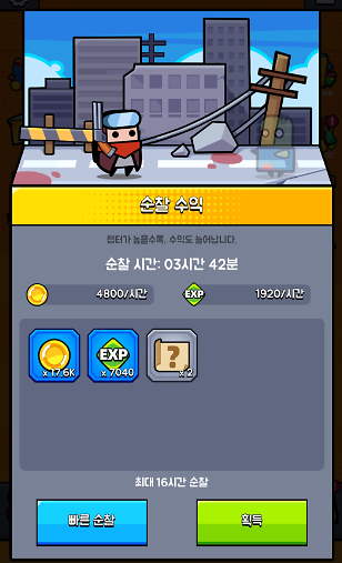 순찰의 보상은 좋은 편입니다. 순찰을 클릭하고 16시간 뒤에 획득을 눌러 보상을 받기만 하면 됩니다. 16시간을 초과하면 보상이 더 이상 증가하지 않습니다. 순찰 옵션은 전투와 동일한 화면에 있습니다.