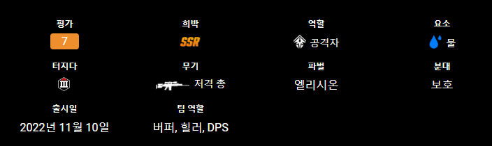| 아군 전체의 크리티컬 확률과 공격력을 강화할 수 있음 | 스나이퍼 라이플은 근거리에서 제대로 쓰기 힘듬 |