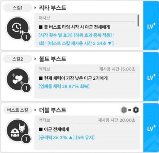 버스트 스킬 쿨타임 감소, 공격력 증가, 체력이 낮은 아군 2인의 엄폐물 체력 회복 등 다방면에서 뛰어난 버프를 보유하고 있죠. 그 가운데 독보적인 성능을 보이는 부분은 버스트 스킬 쿨타임 감소와, 리타 버스트 스킬 사용시 아군 전원 공격력 대폭 상승일 것입니다.