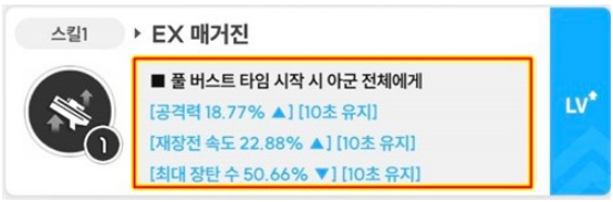 EX 매거진은 풀버스트 타임 시작시 아군 전원의 공격력 상승, 재장전 속도 상승, 최대 장탄수 감소로 빠른 평타 순환을 이끌어내는 버프입니다. 즉 프리바티는 리타나 볼륨의 버프 효과를 더욱 끌어올려주는 서브 버퍼인 셈이죠. 추가 효과 특성상 평타에 특화된 딜러와 궁합이 잘맞는 버퍼입니다. 최대 장탄 수를 줄이기 때문에 마지막 탄 소진시 추가 효과를 발동시키는 딜러라면 더더욱 그렇죠.
