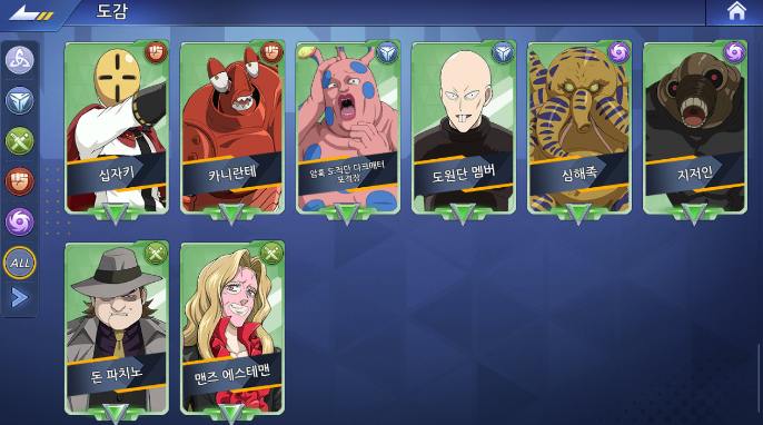 ⑧ [도감]에서는 카테고리 별 캐릭터 목록을 확인할 수 있으며, 캐릭터를 클릭할 경우 해당 캐릭터의 상세 정보를 확인할 수 있습니다.