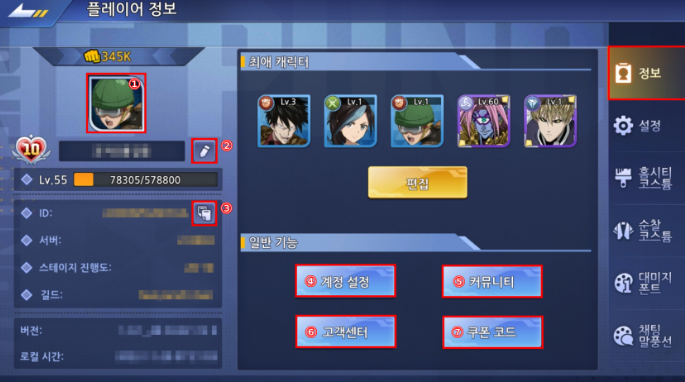 : 정보 페이지에서는 현재 계정의 레벨, 캐릭터 ID 및 서버, 스테이지 진행도, 길드 정보 등을 확인할 수 있습니다.