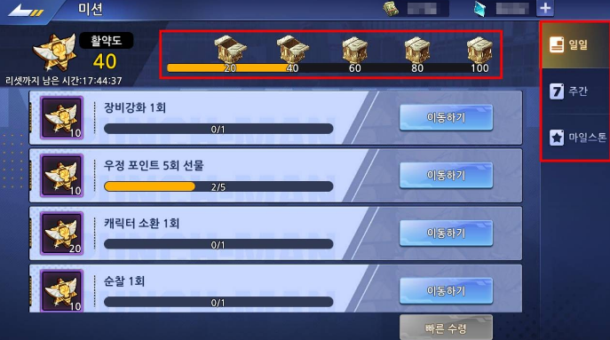 - 일간, 주간 미션에서는 미션 달성 시 '활약도'를 획득할 수 있습니다.
