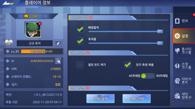 ③ 언어 설정에서 언어 및 플레이 서버를 선택할 수 있습니다.