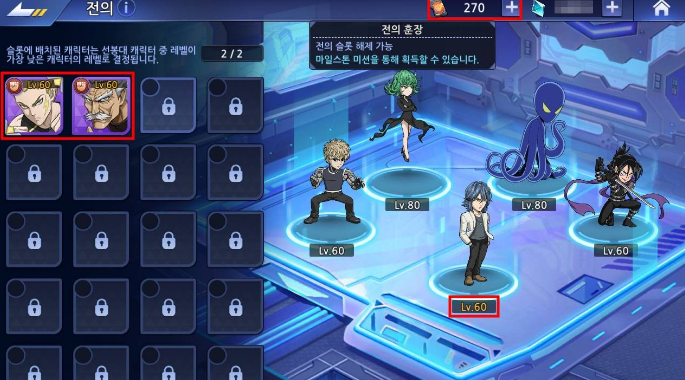 : 레벨이 가장 높은 캐릭터 5명이 자동으로 선봉대에 선정이 됩니다.