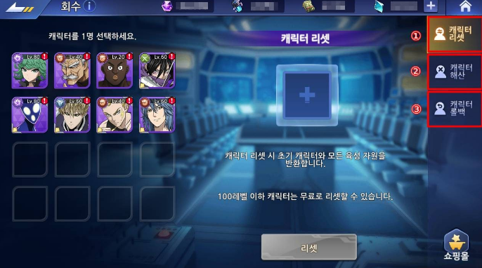 ⑥ [회수]에서는 캐릭터 리셋, 해산, 롤백을 진행할 수 있습니다.