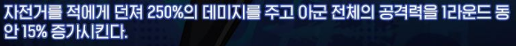 사교권 | 정면의 세로 라인의 적을 공격하여 타겟당 300%의 데미지를 입힌다. | |
