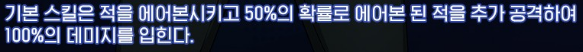 빠른 연속 펀치 | 기본 스킬은 100% 확률로 적을 에어본시키고 50%의 확률로 에어본 된 적에게 3콤보 추가 공격으로 총 100%의 데미지를 입힌다. | |