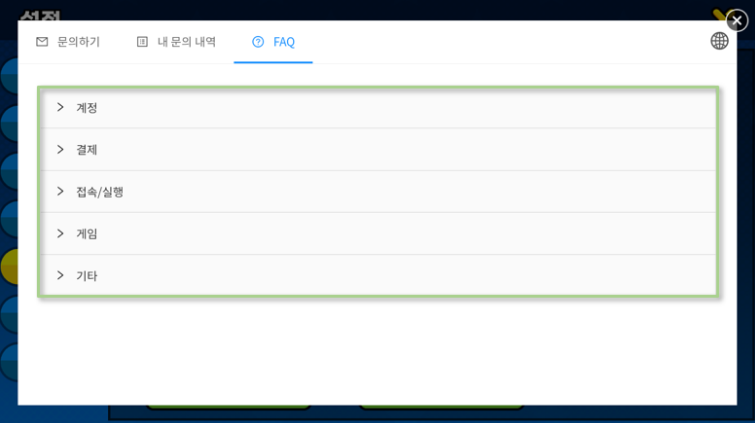 계정, 결제, 접속/실행, 게임, 기타 카테고리별 FAQ를 확인할 수 있습니다.