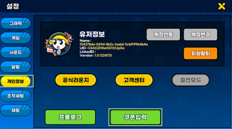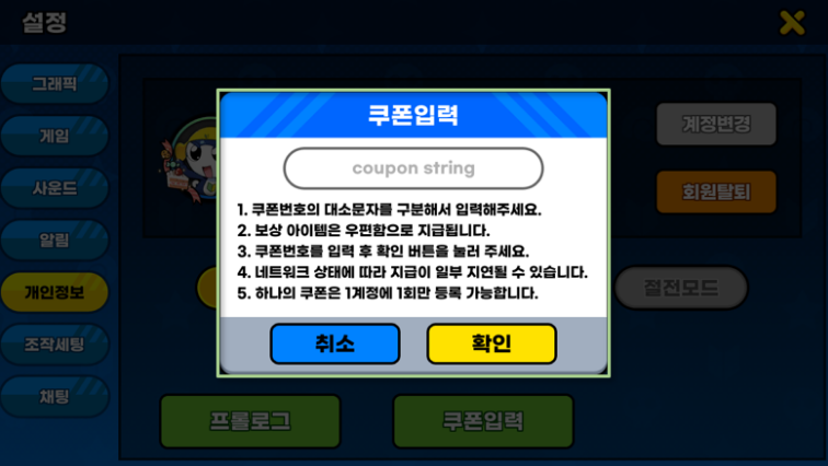 메인룸 우측 상단의 [설정] → [개인정보] → [쿠폰 입력]에서 쿠폰을 입력하실 수 있습니다.