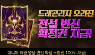 드래곤라자 오리진에서 전설 변신 확정권을 얻으실 수 있는 이벤트로서 매냐 회원에게는 해당 소환권이 100% 지급되는 이벤트입니다.