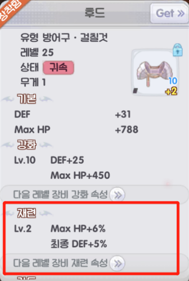 유의해야 할 점은, 같은 부위의 장비라면 레벨이 다르더라도 재련 후 증가하는 재련 속성이 동일하다는 점입니다.