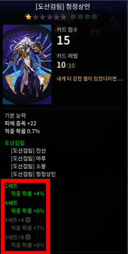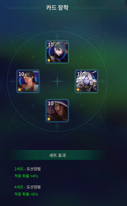 같은 세트의 카드를 일정 개수 이상 착용할 경우 전투에 도움이 되는 세트 효과가 적용 됩니다.