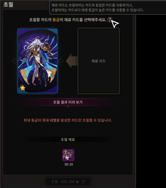 초월할 카드는 1) 동급의 재료 카드 2) 블랙 조커 더스트 아이템을 소모하여 초월 가능합니다.