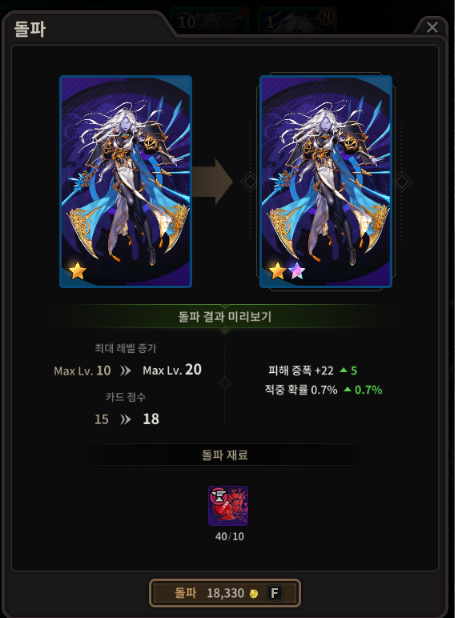 돌파 후 카드의 등급(별)이 추가되며, 강화 가능 레벨이 상승됩니다.