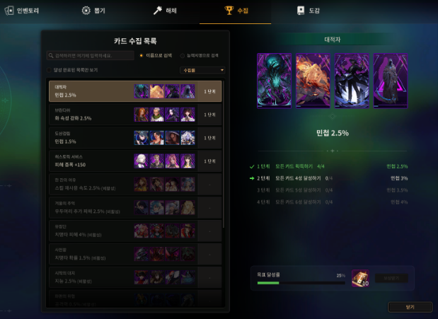 한 컬렉션의 카드를 모두 획득할 경우, 해당 컬렉션의 단계가 활성화되어 캐릭터의 능력치가 상승합니다.