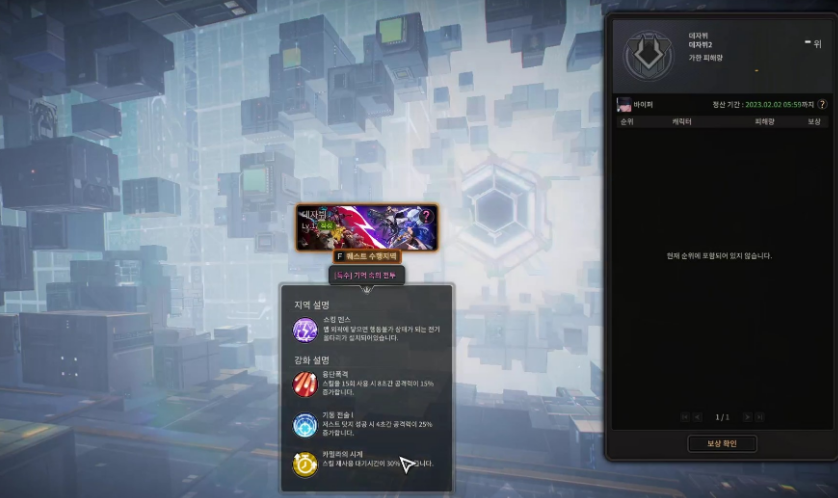 [데자뷔]는 제한 시간 동안 죽지 않는 보스와 전투하여, 누적한 피해량에 따라 보상을 획득할 수 있는 경쟁형 콘텐츠입니다.