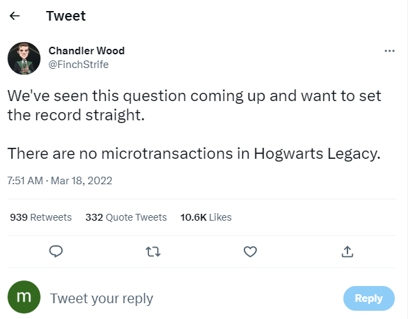 또한 커뮤니티 관리자인 챈들러 우드 역시 호그와트 레거시에서 유료 컨텐츠나 과금은 말이 되지 않는다고 공식화했습니다.