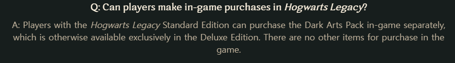 결론부터 말하자면 호그와트 레거시에는 과금요소가 없습니다. 개발자들은 공식 FAQ에서 이 게임에는 어떤 형태의 인게임 유료 컨텐츠를 제공하지 않을 예정이라고 밝혔습니다.