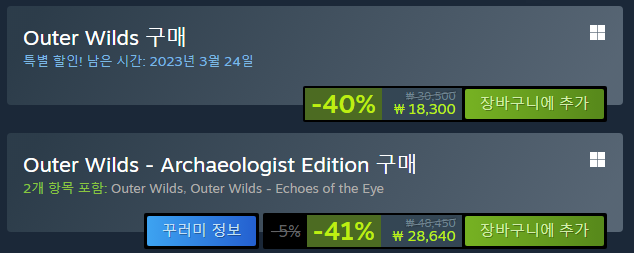 아우터 와일즈는 현재 세일 가격은 18,300원에 리스팅되어 있구요. 번들상품의 경우 28,640원에 구매하실 수 있답니다.