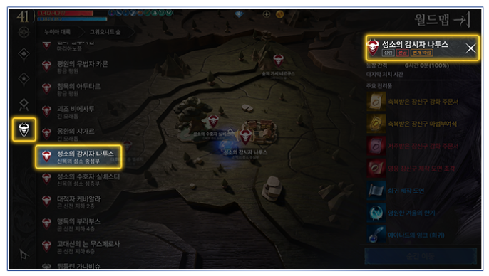 퀘스트 지역이 자동 이동이 불가능한 지역인 경우에는 우측 상단 순간 이동 버튼을 누르면 빠른 이동이 가능합니다.