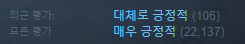스팀에서는 대체로 긍정적과 매우 긍정적인 평가를 받고 있네요.