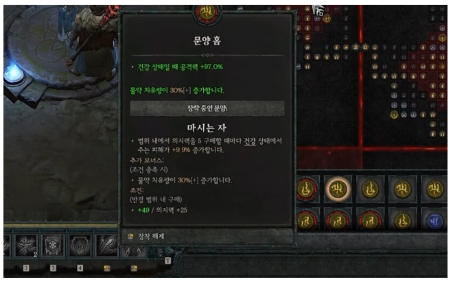 문양 중에서는 '마시는 자' 문양을 선택했는데요. 정복자에서 '마시는 자' 문양을 선택한 이유는 희귀 노드들의 활성화를 위해서는 능력치 보충이 필요했기 때문입니다. 의지력을 필요로 하는 문양 중 대미지를 높일 수 있는 문양이기도 하여 '마시는 자'를 채용했습니다.