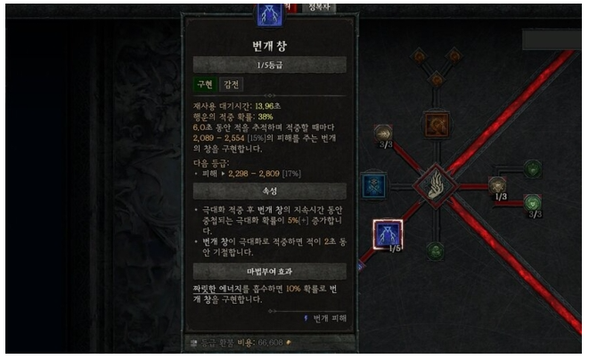 주로 일반 몬스터를 잡을대는 얼음 파편을 많이 이용하는데요. 얼음파편은 광역딜은 좋지만 단일 딜이 부족해 보스를 상대할 시 화력이 부족한 경우가 생기게 됩니다. 보통 보스의 비틀거림 수치를 쌓아서 딜을 쏟아붓게 되는데, 고단계에서는 그로기 상태를 3번 이상 볼 상황도 생기기 때문이에요. 따라서 비틀거림 수치를 빨리 채우기 위해서 <불러낸 번개 창>을 채용하면 효과가 좋습니다. 보통 보스를 상대할 때는 냉대에서 스킬 포인트 2개를, 서릿발에서 1포인트를 빼서 <불러낸 번개 창>을 찍고 사용하시면 됩니다.