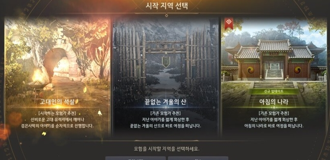 게임을 시작하시면 고대인의 석실과 끝없는 겨울의 산, 아침의 나라 중에서 시작 지역을 고를 수 있는데요.