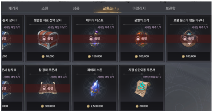 주 단위로 재고가 보충되는 아이템 중에서는 균열의 조각, 보물 몬스터 행운 바구니를 먼저 구매하면 됩니다. 여기서 레어 등급 페어리를 보유하고 있다면 페어리 더스트를 추가로 구매하면 되는데요. 강화 주문서는 다른 부위에 비교해 강화 확률이 낮은 편이므로 골드가 넉넉할 때에만 구매하는 걸 추천드립니다.