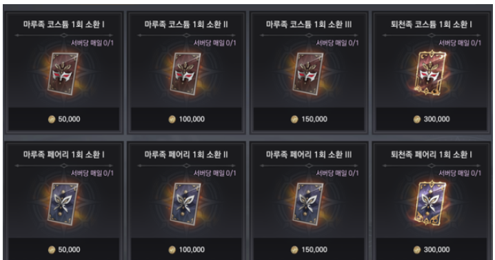 소환 비용은 5만 골드로 시작해 마지막 소환 비용이 30만 골드까지 늘어나는데, 이 때문에 3번째 소환부터는 선뜻 구매 버튼을 누르기 망설여집니다. 아직 400회 소환 업적을 달성하지 못했다면 다소 부담되더라도 매일 모든 소환을 구매하는 것이 좋습니다. 이후에는 자신의 상황에 맞춰 원하는 만큼 소환 횟수를 조정하면 됩니다.