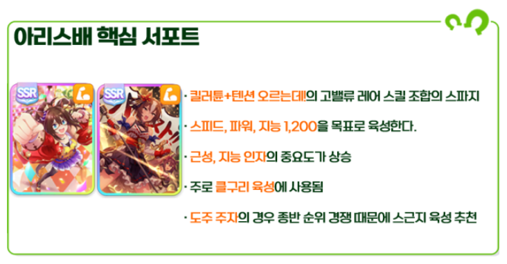 아리스배는 뉴트랙에서 최초로 열리는 중거리 대회로, 고효율의 레어 스킬을 보유한 스피드 + 파워 + 지능(이하 '스파지') 육성과 스탯의 벨류를 높이는 스피드 + 근성 + 지능(이하 '스근지') 육성으로 나뉘게 되는데요.