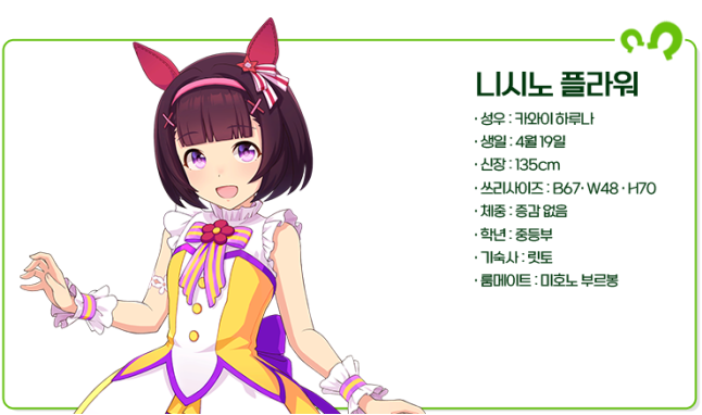 니시노 플라워는 게임 내에서 유일한 재능을 인정받아 월반한 우마무스메로 설정되어있으며, 실제 연령은 초등학생급이라고 게임 내에서도 언급이 되는 진짜배기 천재 소녀입니다.
