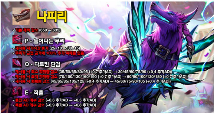 반대로 지나치게 높은 승률을 기록하고 있는 챔피언들은 하향 목록에 이름을 올렸습니다. 먼저 신규 챔피언 나피리의 경우 기본 체력이 650 > 635로 줄고, 패시브로 소환하는 무리의 주기가 길어지고, 근거리 공격에 100% 추가 피해를 입게 되어 전반적인 내구력이 감소했습니다.
