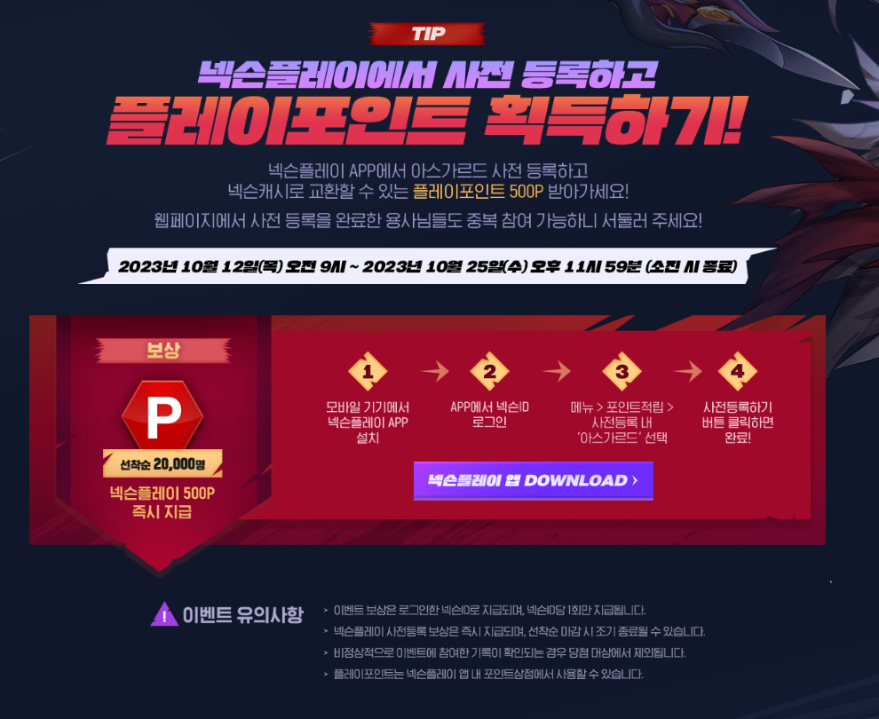 메뉴 > 포인트적립 > 사전등록 내 '아스가르드' 선택하고