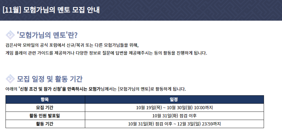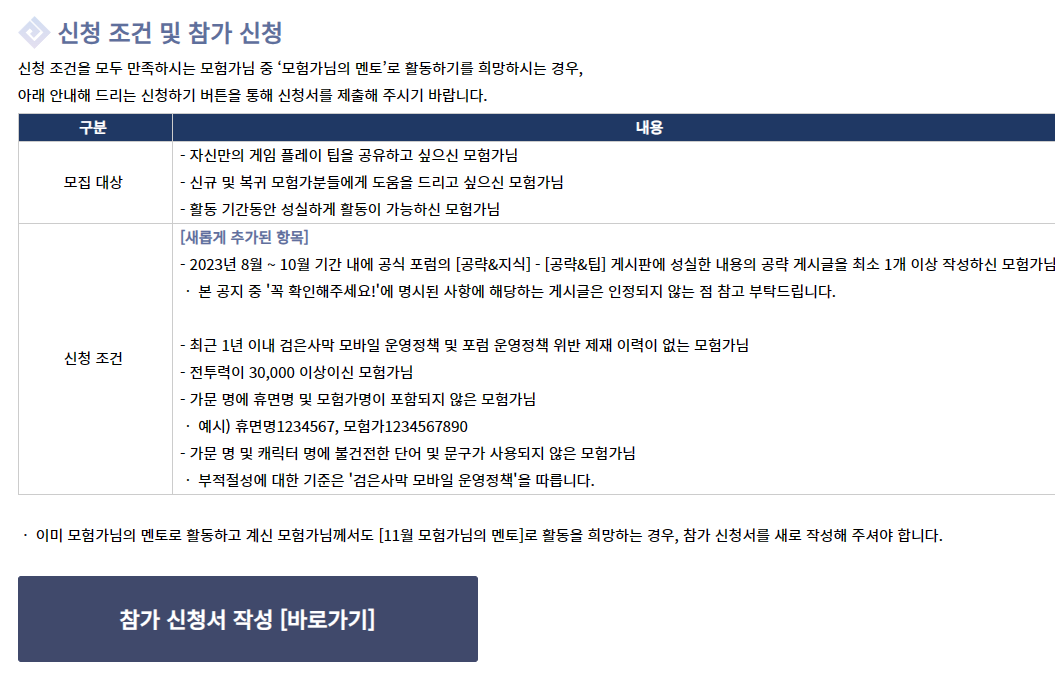 '신청 조건 및 참가 신청'을 만족하시는 모험가님께서는 [모험가님의 멘토]로 활동하게 됩니다.