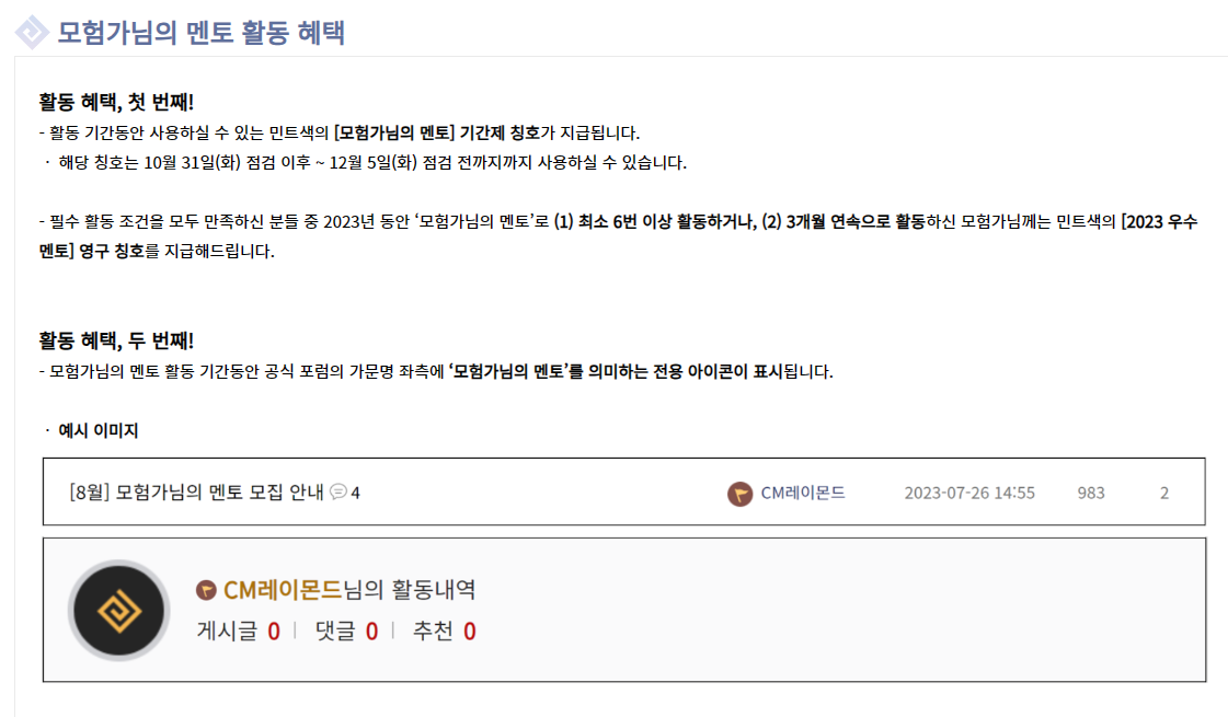 공식 포럼에서 보이는 가문명 옆에는 모험가님의 멘토 전용 아이콘이 추가됩니다.