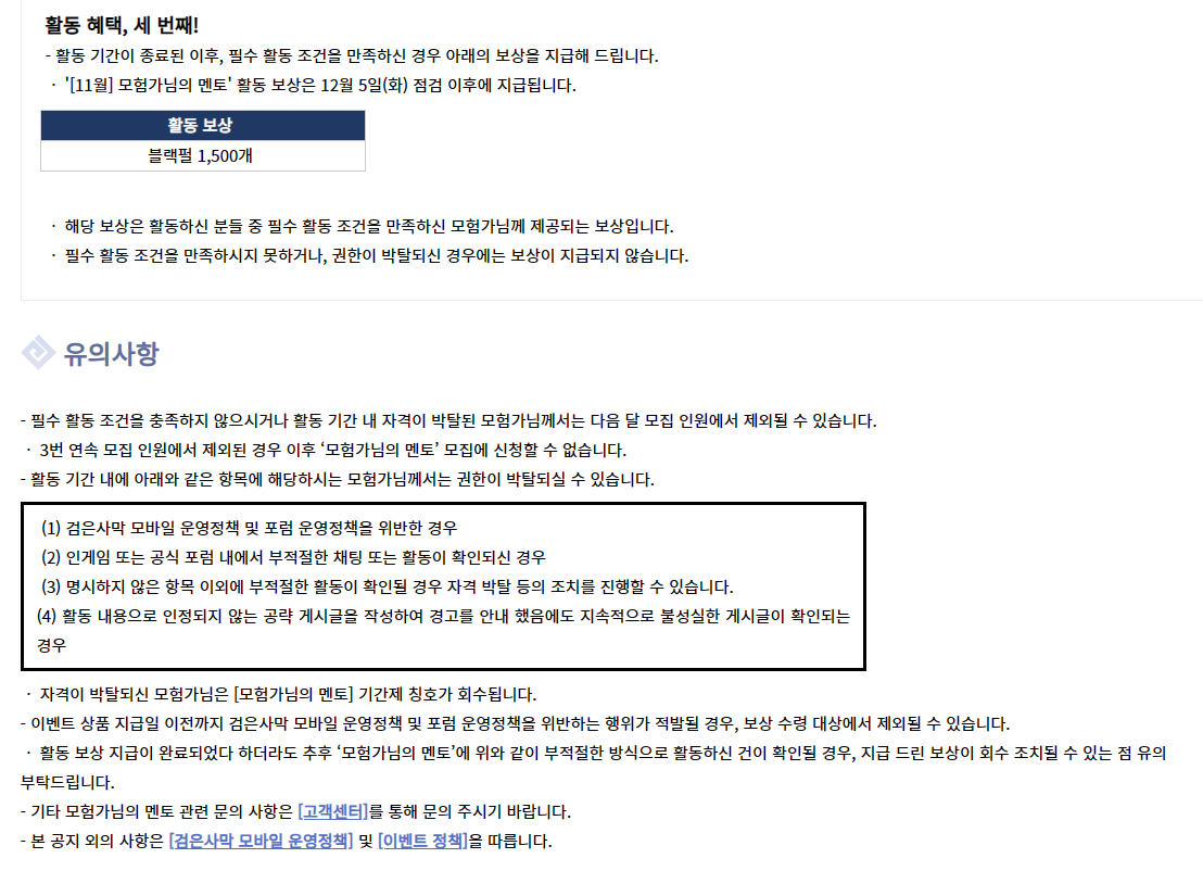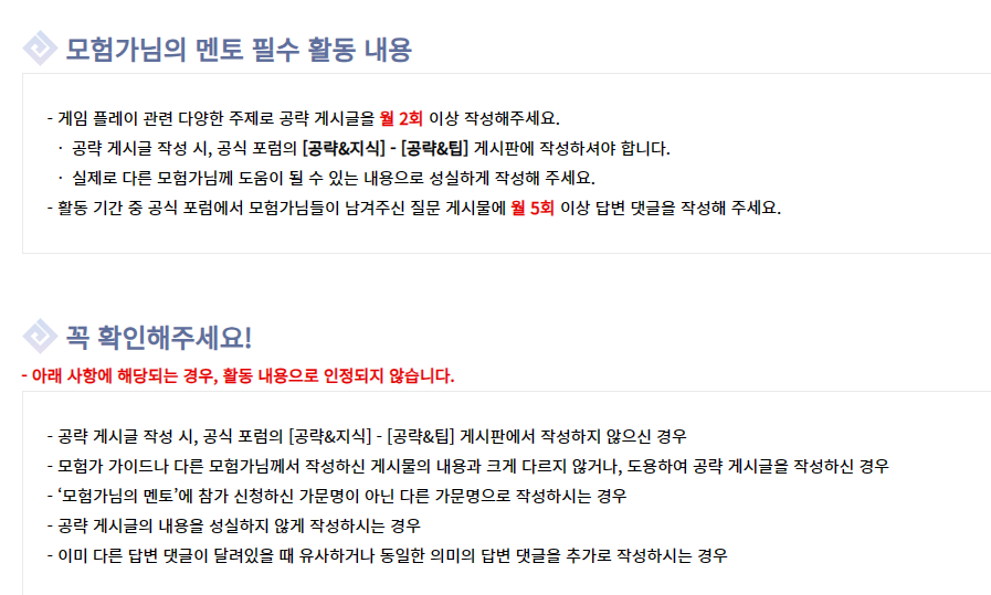 활동 기간 중 공식 포럼에서 모험가님들이 남겨주신 질문 게시판에 월 5회 이상 답변 댓글을 작성해주세요~!