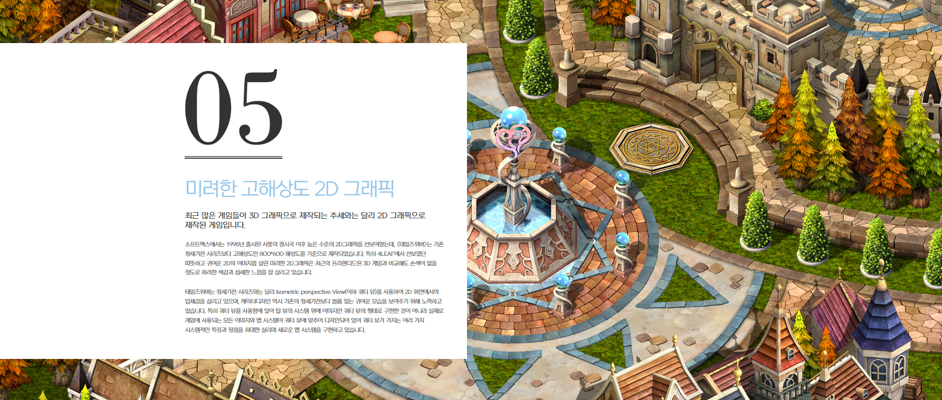 실제로 게임에 사용되는 모든 이미지와 맵 시스템이 쿼터 뷰에 맞추어 디자인되어 있어 쿼터 뷰가 가지는 여러 가지 시스템적인 특징과 장점을 최대한 살리며 새로운 맵 시스템을 구현하고 있습니다.