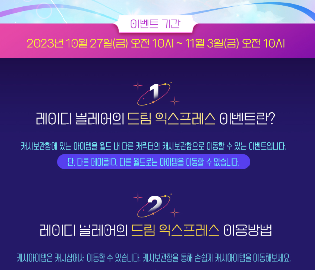 캐시보관함에 있는 아이템을 메이플 월드 내 다른 캐릭터의 캐시보관함으로 이동할 수 있는 이벤트입니다.