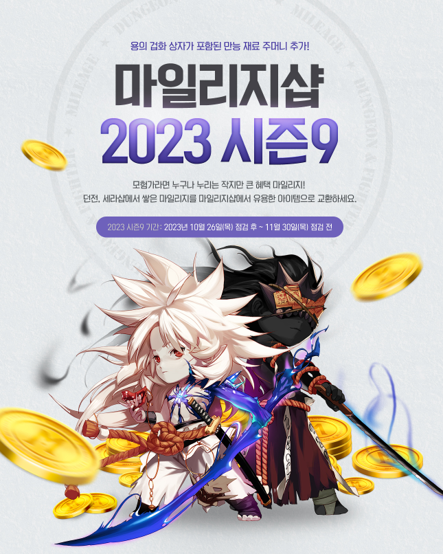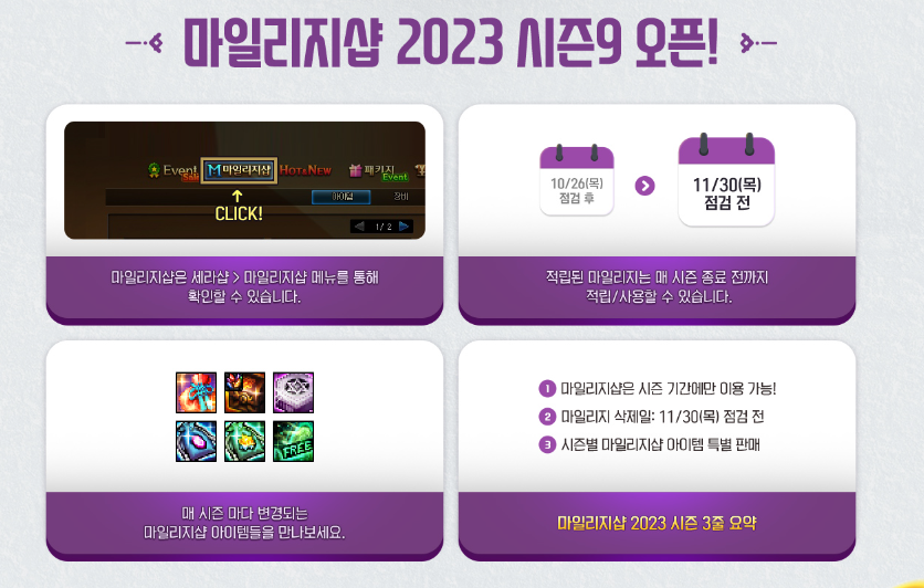 - 2023 시즌9에서 사용 가능한 마일리지는 2023년 10월 26일(목) 점검 후 부터 적립됩니다.