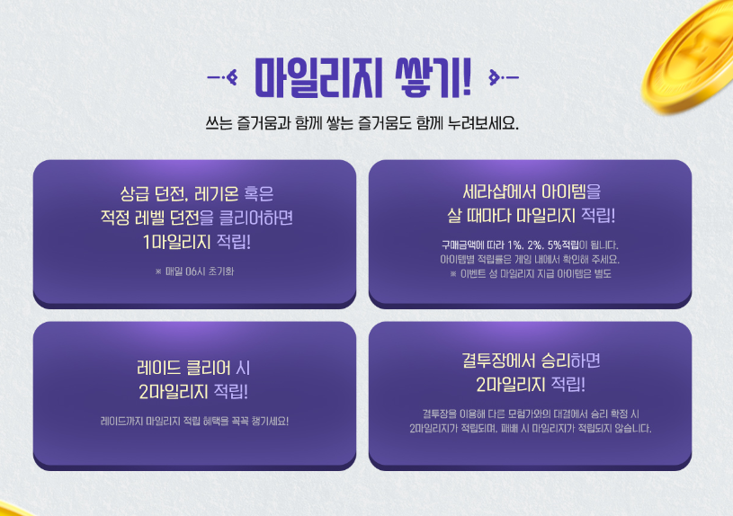- 결투장 승리 시에만 2마일리지가 적립되며 패배 시 적립되지 않습니다.